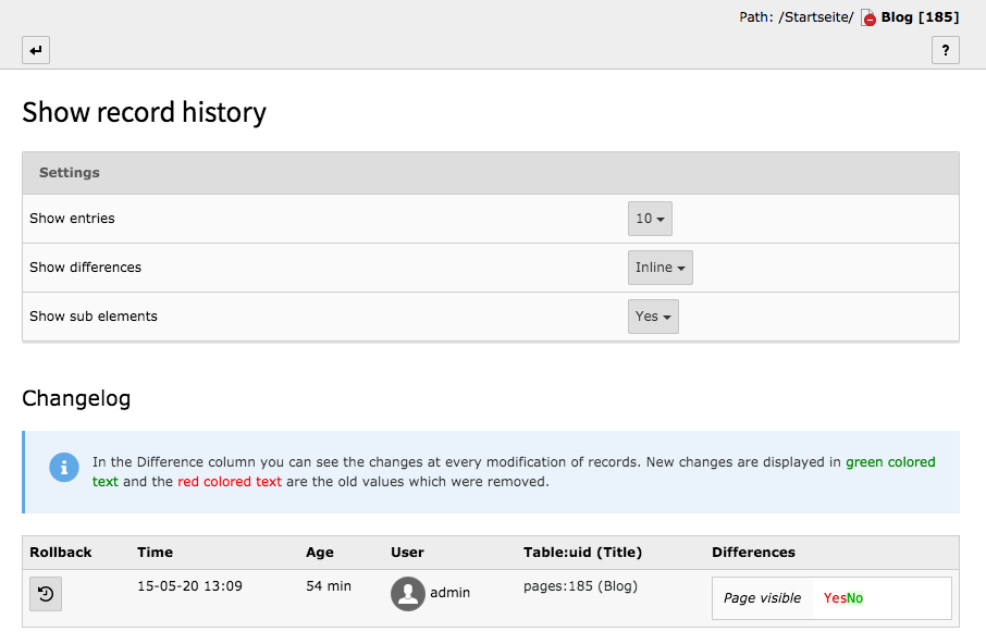 - Under Changelog, you can see the change history oft the TYPO3 page – choose the action you want to undo.