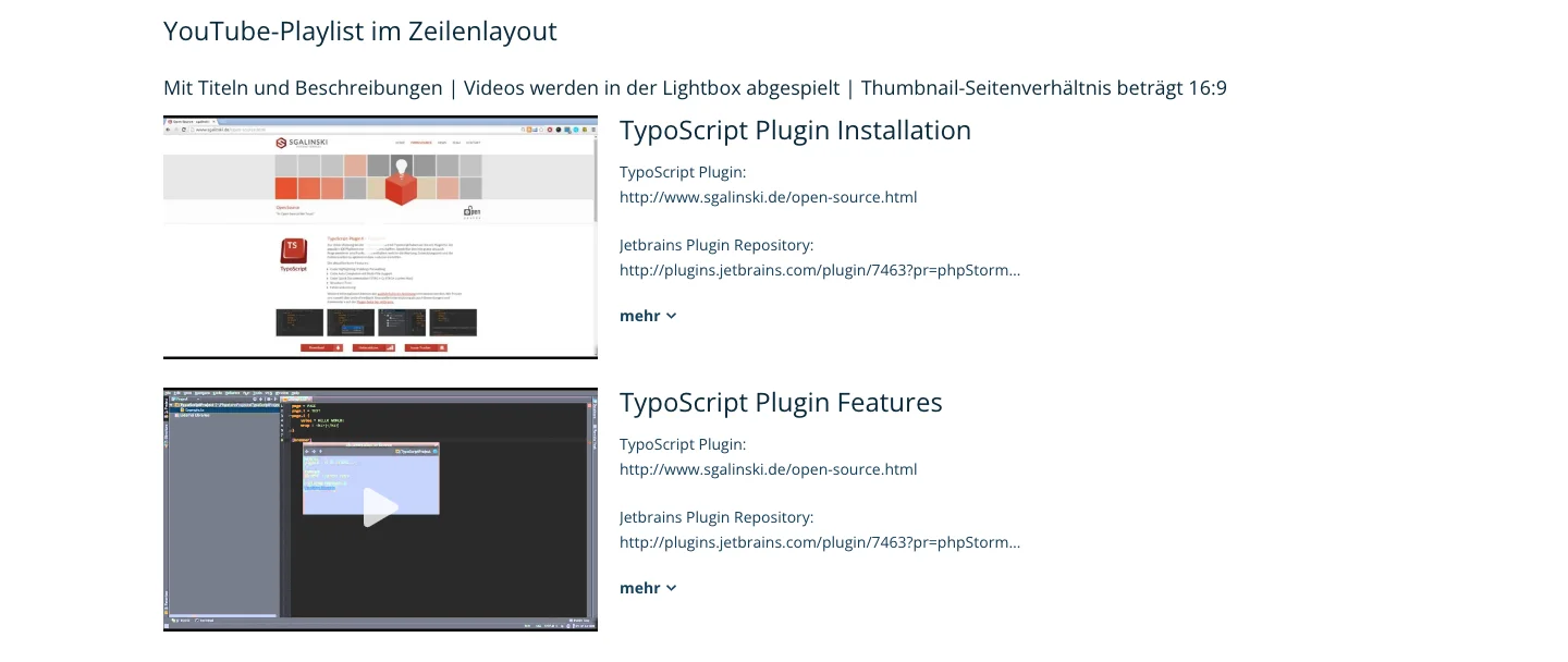With sg_video, videos from various sources can be presented with a consistent look. At the same time, there is plenty of flexibility for customization: Using the available settings for layout, information, thumbnails, and behavior, individual videos can be highlighted or integrated into thematic video overviews. Depending on your needs, you can display titles and descriptions, play videos in a lightbox or directly on the page, and use different layouts. The interface remains clear and user-friendly for editorial use.
