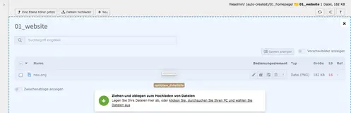 Egal in welchem Ordner Sie sich im Verzeichnisbaum befinden, Sie werden im rechten Bereich immer die Inhalte des Ordners sehen. Über dem Inhaltsbereich sind immer vier Optionen zu sehen. Mit einem Klick auf den Button Eine Ebene höher gehen gelangen Sie in den übergeordneten Ordner. Bei Klick auf Dateien hochladen öffnet sich ein Fenster zum Hochladen von Dateien. Dateien können aber auch über Drag-and-drop in einen Ordner geschoben und hochladen werden (siehe Screenshot).