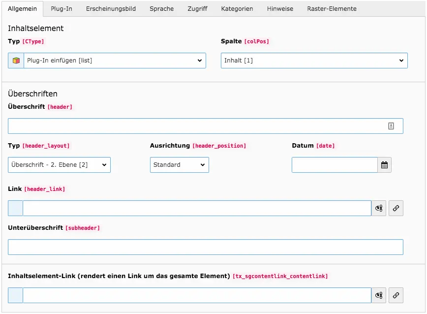 Der Tab Allgemein verfügt über die gleichen Felder wie das Inhaltselement Nur Überschrift. In diesem Reiter entscheiden Sie also lediglich, ob das Formular eine Überschrift tragen soll.