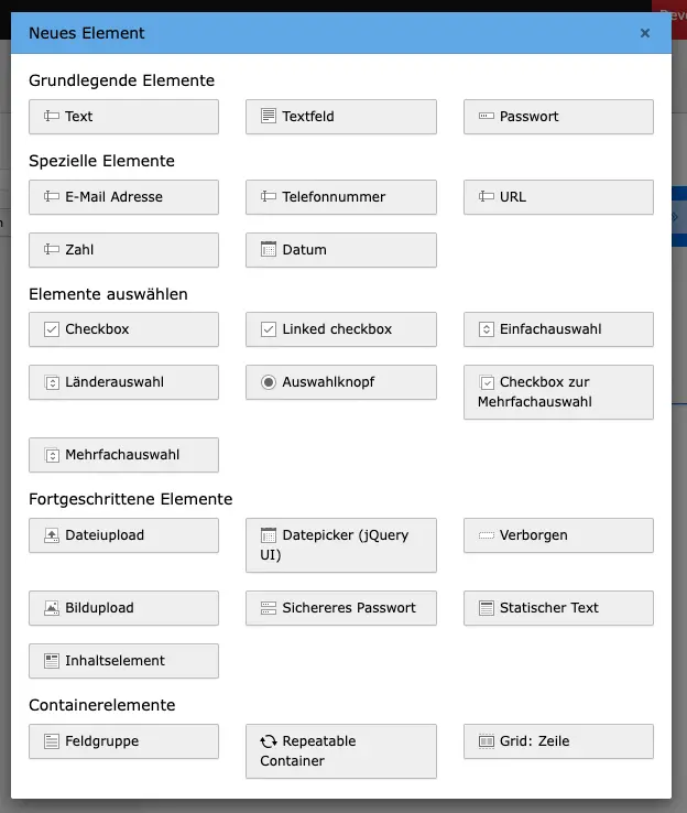 Um ein neues Element hinzuzufügen, wählen Sie eine Seite/einen Schritt aus klicken im mittleren Bereich unten auf den Button Neues Element erstellen. Suchen Sie dann aus der Liste der Elemente das aus, was sie benötigen. Die verfügbaren Elemente sehen Sie im Screenshot zum leeren Formular.