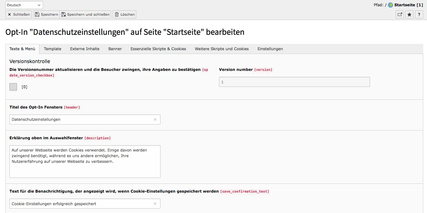 Ähnlich wie bei essentiellen Cookies können Sie unter dem Feld Beschreibung alle Cookies angeben, die von externen Skripten kommen. Die Informationen sind im Frontend im Cookie-Informationsteil des Opt-In-Feldes zu sehen.
