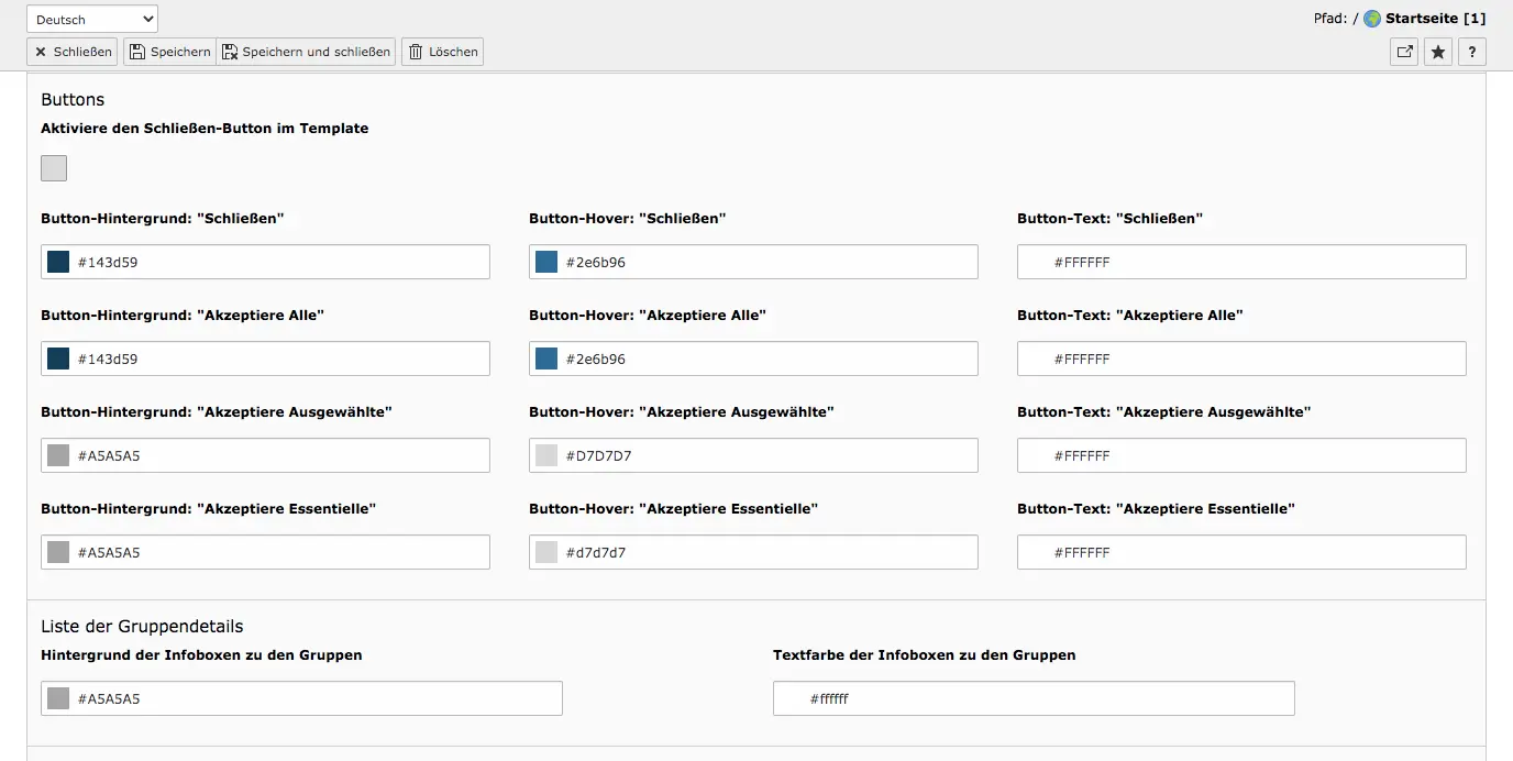 Zu jedem Button in dem Cookie Consent Fenster besteht die Möglichkeit den Hintergrund, das Button-Hover (Mouseover-Effekt zum Anzeigen einer verfügbaren Interaktion) und die Textfarbe verschieden zu gestalten. Zum Schluss passen Sie noch die Farben für die Liste der Gruppendetails an.