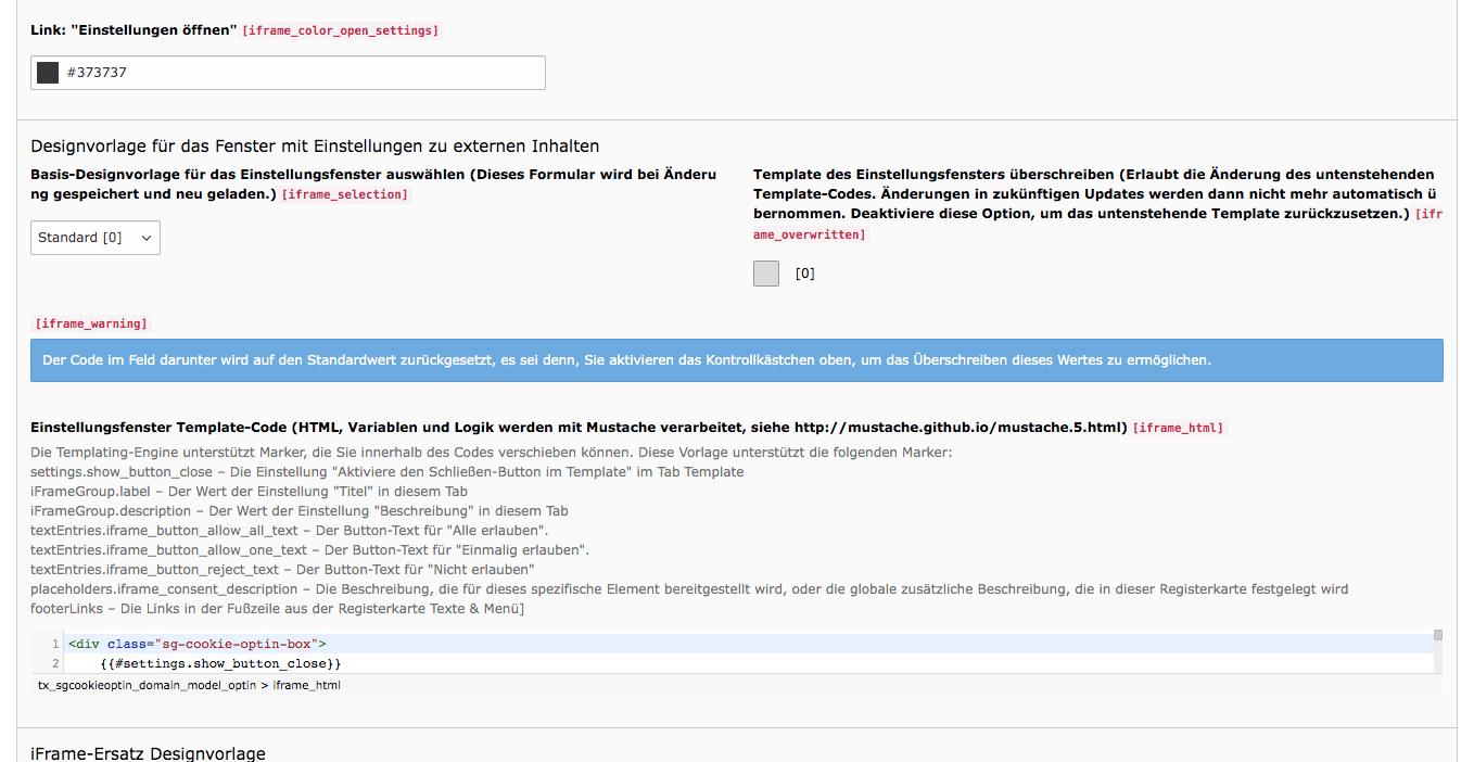 Es ist außerdem möglich, direkt im Backend die Designvorlagen anzupassen oder ganz zu ändern. Setzen Sie dafür ein Häkchen bei Template des Einstellungsfensters überschreiben, um den Code für das Design des Fensters mit den Einstellungen zu externen Inhalten zu überarbeiten und ein Häkchen bei iFrame-Ersatz-Template überschreiben, um das Template des Fensters zu ändern, das anstelle des iFrames zu sehen ist. Durch einen überschriebenen Code werden zukünftige Updates nicht mehr automatisch übernommen. Wenn die Option deaktiviert wird, wird das Template wieder zurückgesetzt.