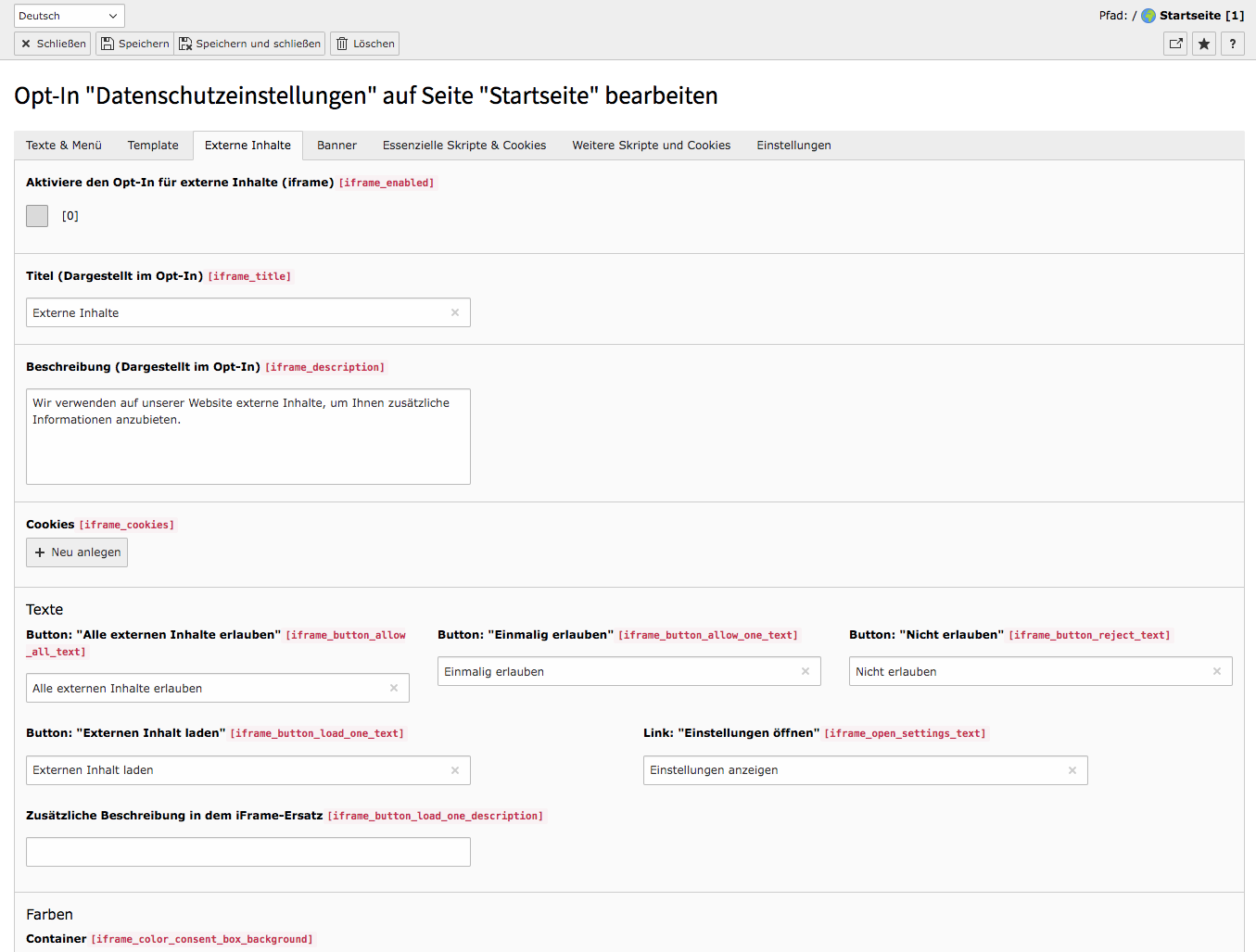 Zum Aktivieren des Cookie Consents für Iframes müssen Sie in der Registrierkarte Externe Inhalte ein Häkchen setzen und die Felder Titel und Beschreibung ausfüllen sowie die Texte für die Button-Beschriftungen festlegen.